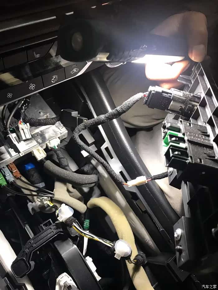 这根线束是自制的线束,直接排线走到驾驶室内的。这个插头就是对接前保险杠的加装线束插头对接,就可以。以后如果拆保险杠,拆装就很方便,直接拔插头就可以了。