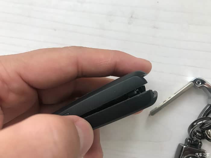 可以清晰地看到遥控钥匙裂开一道缝隙。沿着缝隙,将钥匙分开。