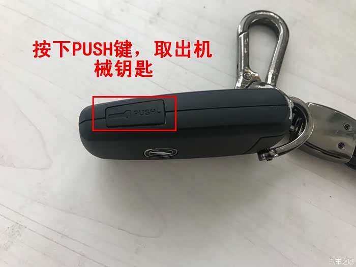 钥匙侧面有个PUSH的机械按键,按下以后,机械钥匙就可以正常拔出了~!