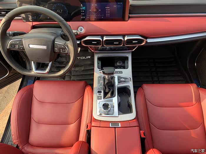 内饰的红色材质用得比较多,其实本人对红色并不太喜欢,但是一坐到车内,发现红色和黑色相搭配也是挺有质感的,软包多,还用到了浅色的拉丝板,整个氛围显得很有档次。