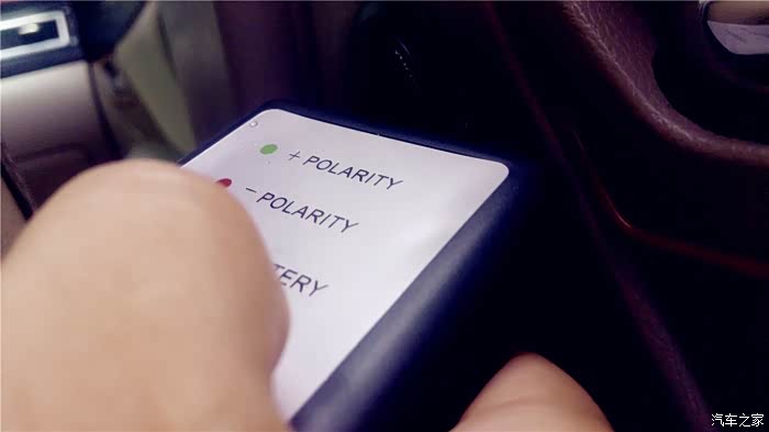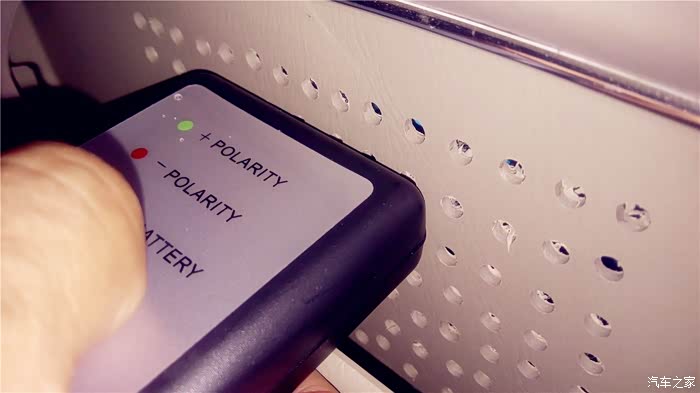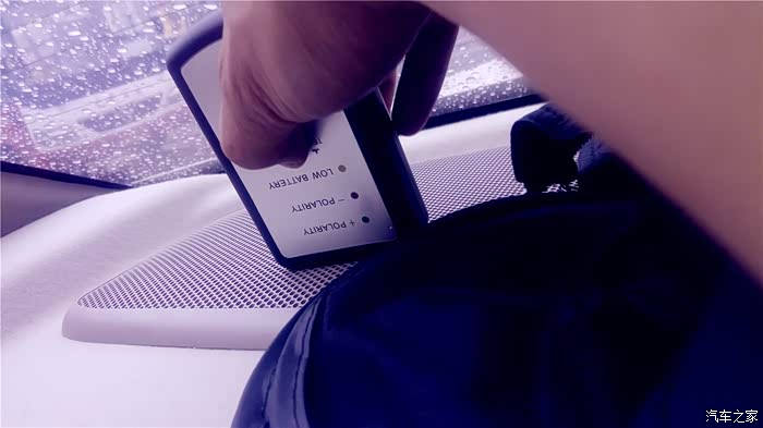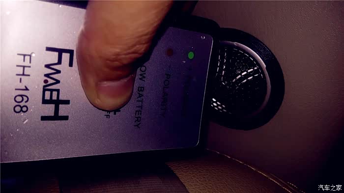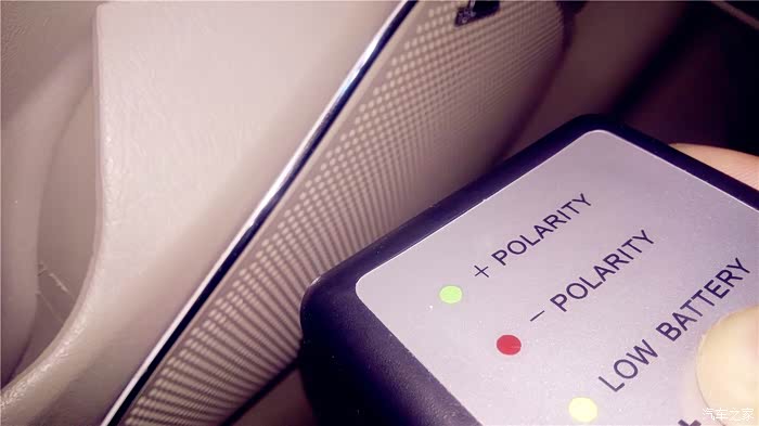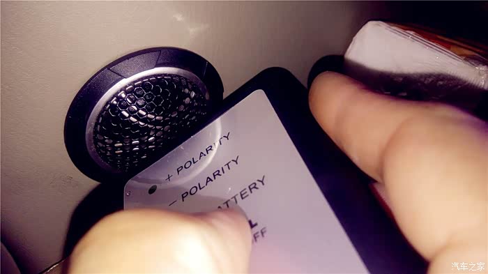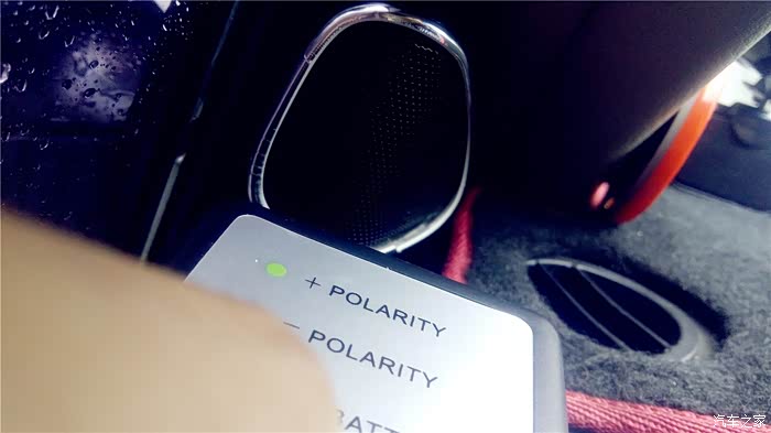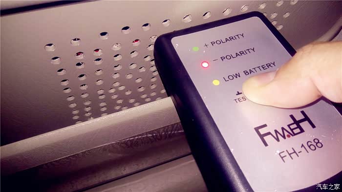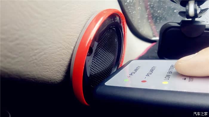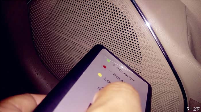 要测试那边的单元喇叭,就把主机的均衡器打开,调节到只有一边出声音,现在测试开始,我把音量调到10,先播放第一首和第二首,OK,我的左右声道是正确的,现在循环播放3和4首,这个“曲目”播放的就是“咚、咚、咚、咚”象打鼓的4个节奏音,每两个“咚”声之间间隔1秒。声音之中可是另有奥秘,三个连续的“咚”声是正相位,接着一个“咚”声是负相位,不断循环。首先我测试左门高音喇叭。为防止别的喇叭声音对相位仪的干扰,最好四门大开,测试时,一定要将相位仪的顶端紧挨着被测试的喇叭。先测左前门高音喇叭,将相位仪贴近喇叭,按下TEST按钮不放,如果是绿灯亮三下,红灯亮一下,说明是正相位,反之红灯亮三下,绿灯亮一下则是负相位。
