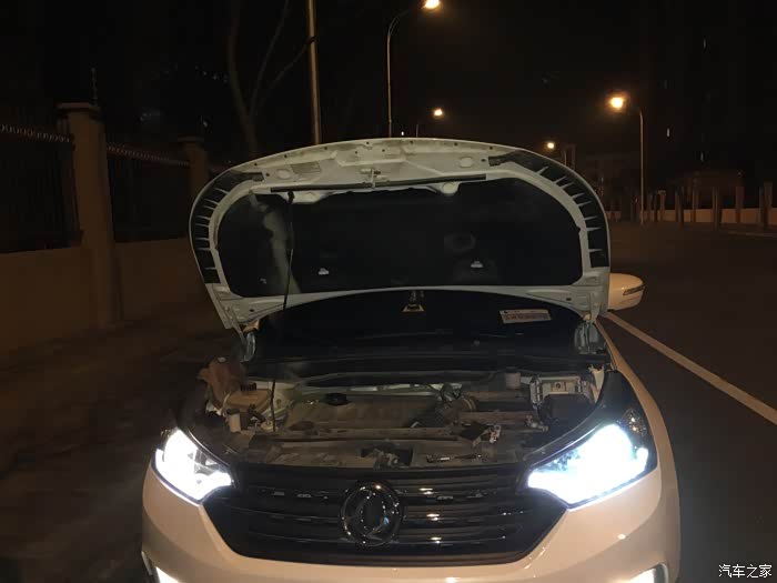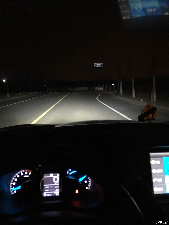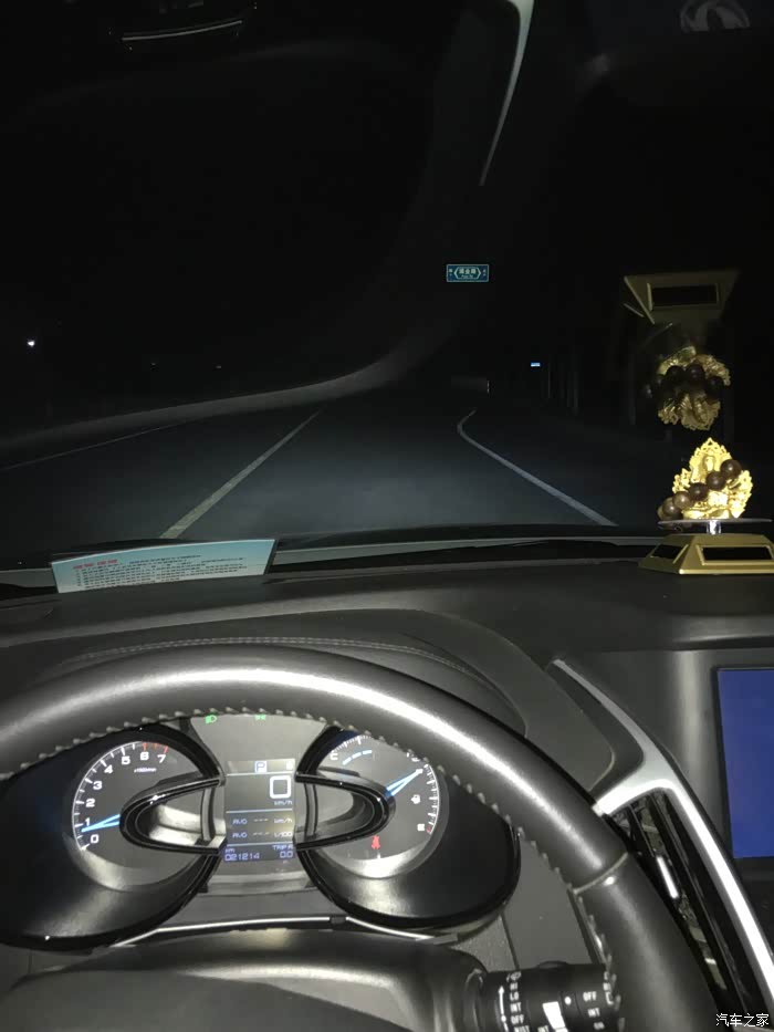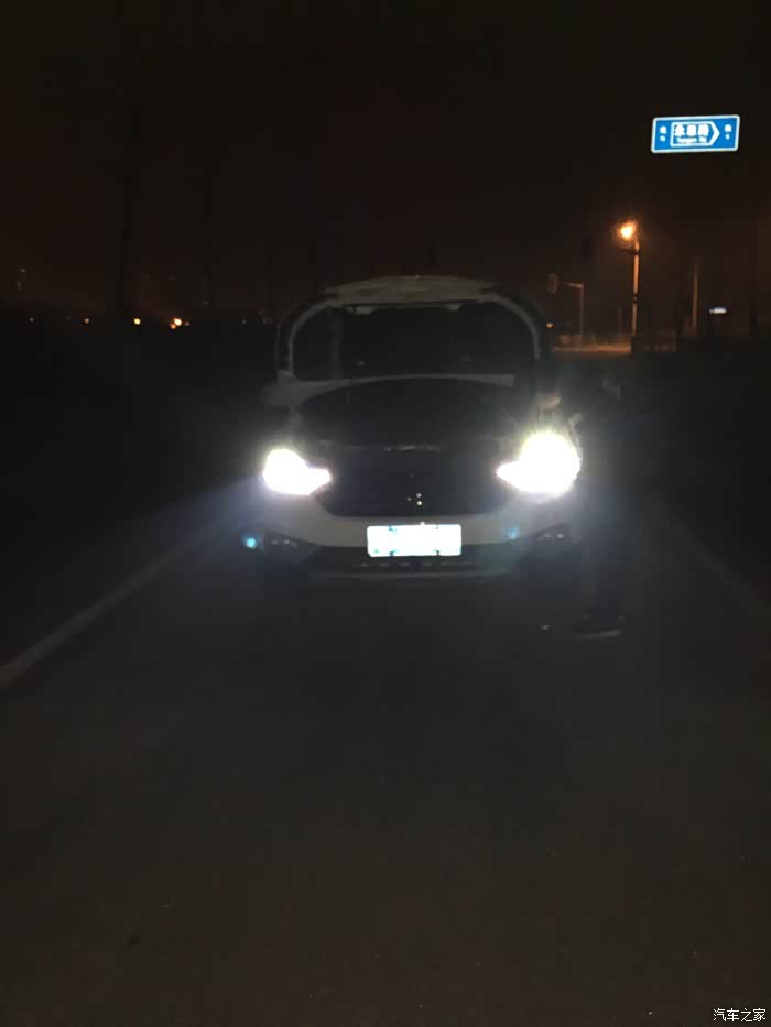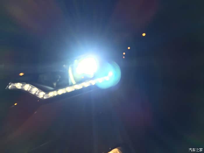 车内看上去的样子,由于手机开了闪光灯,所以感觉外面不是很亮,跟疝气灯差不多亮了已经,启动就亮,不需要等几秒,疝气灯好像需要几秒才可以完全亮。最后说下,因原车自带透镜,光源不散光,远光灯不打算换了,够用就好了。