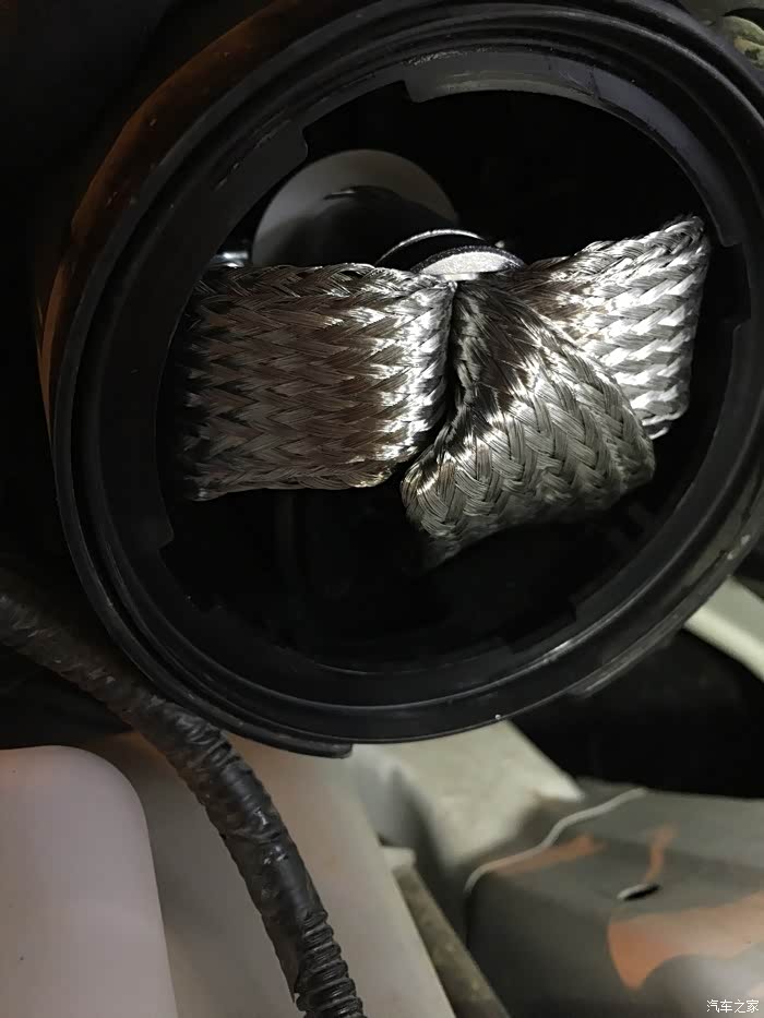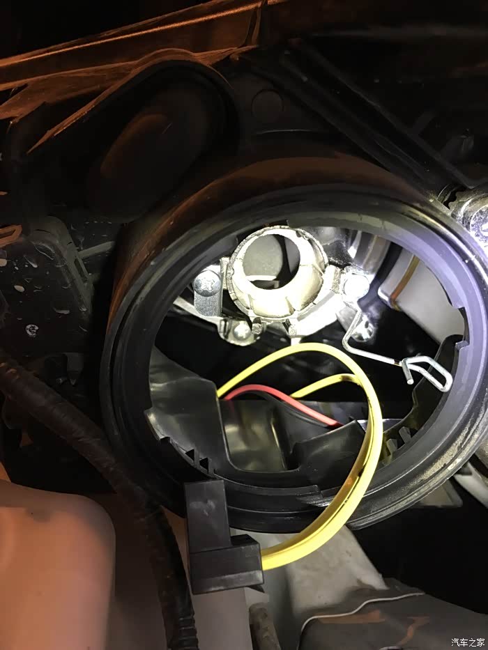 拧开后可以看到原车卤素灯和铁丝卡扣