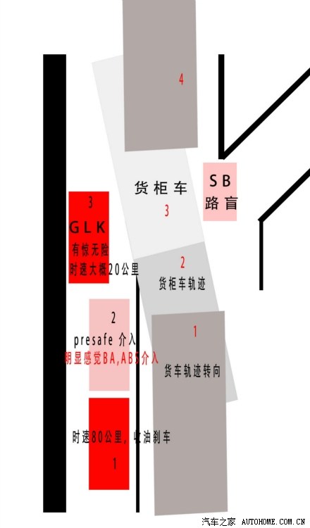 货车司机也看到我的位置,很快从3号位置转向正常车道。辆车最近距离应该在10厘米