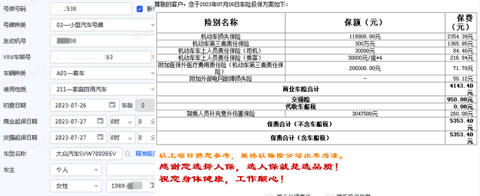 保险谈价格的时候预估是5300左右一百块,今天算出来差不多,300万三者挺好的,就是不知道那个附加外部电网故障损失是啥