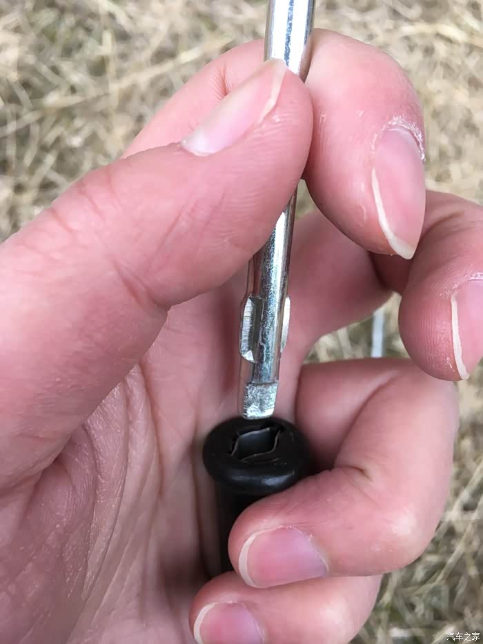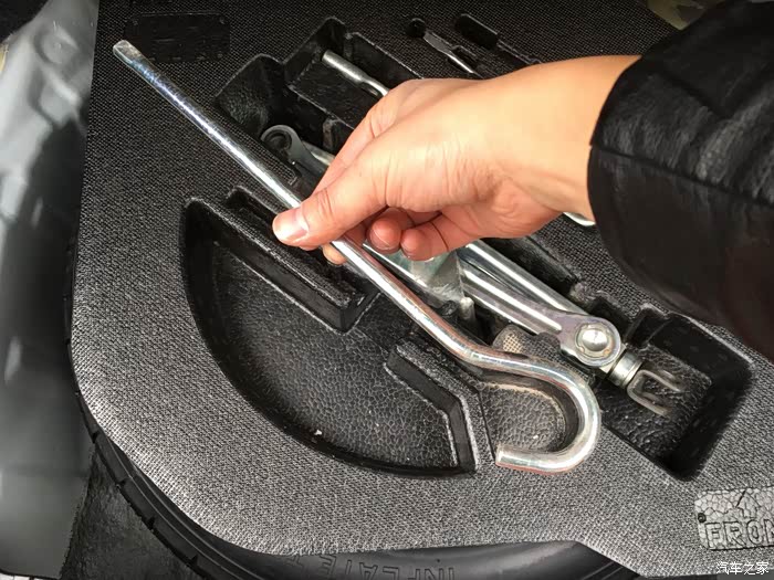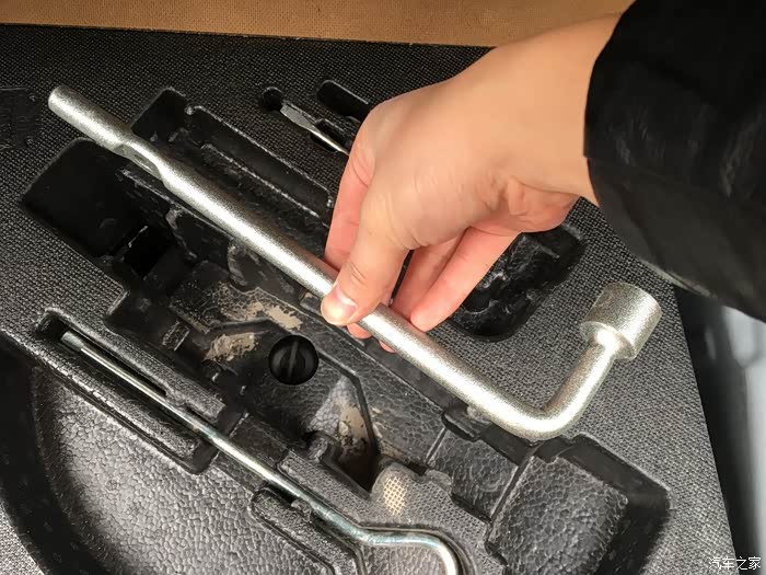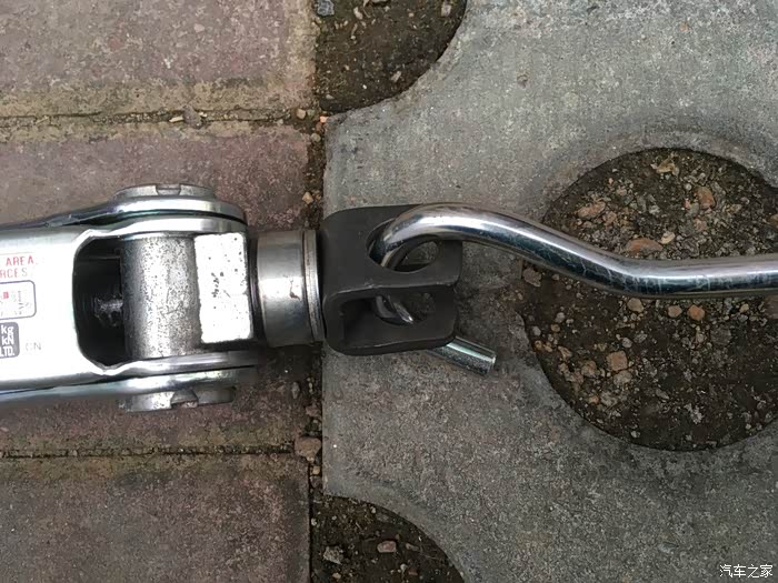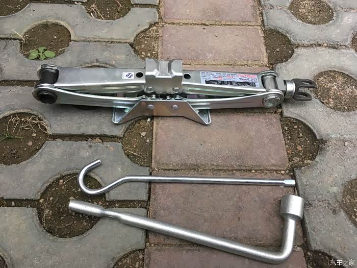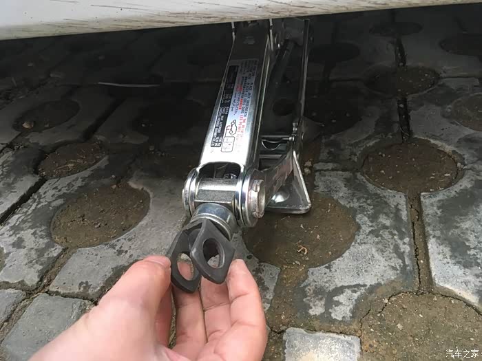 直接把弯勾的直的一端插在千斤顶上半圈半圈的拧,这比说明书上的办法好操作多了。