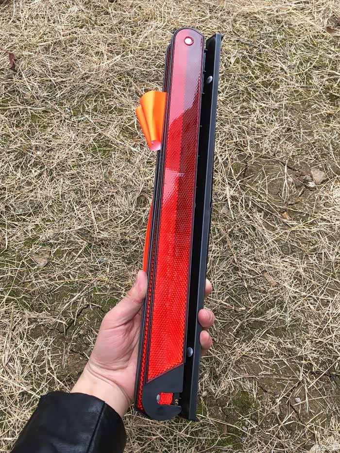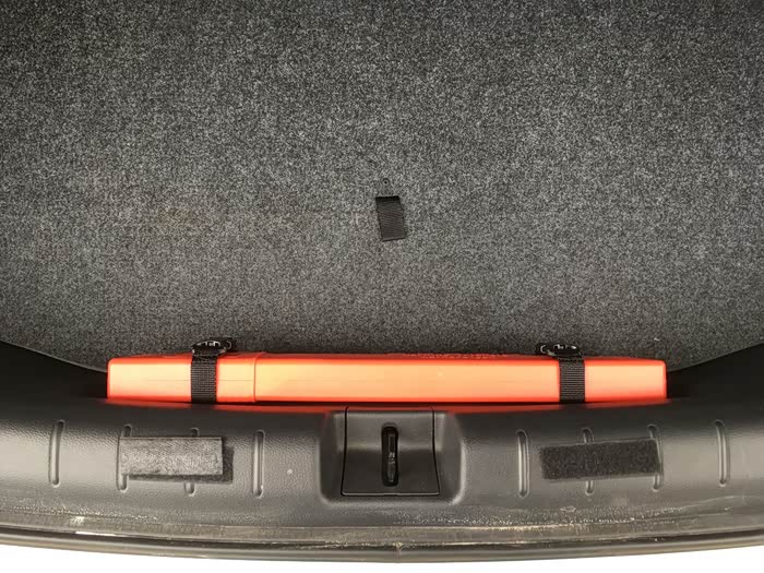 后备箱开口处下方,橙色的是警示牌
