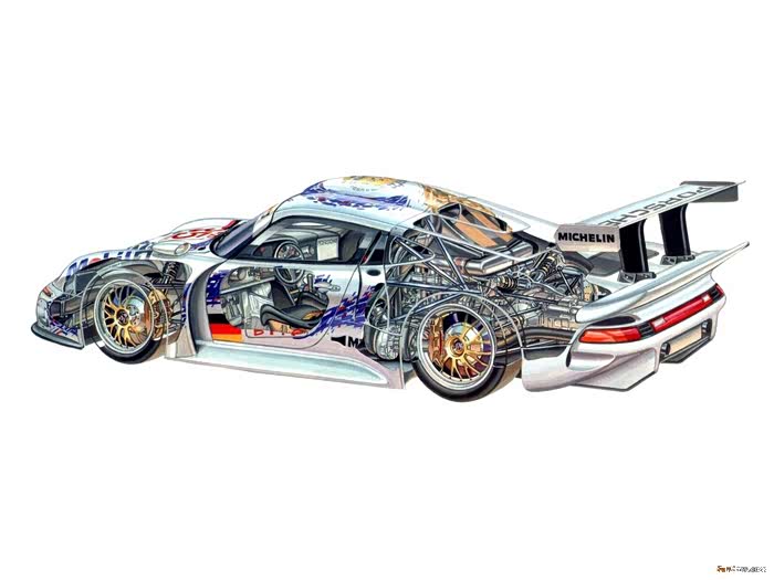 这款车实际上与当时的911几乎没有什么共同之处,只是与量产跑车共享前大灯和后大灯。然而,其额底盘是共享的(993)911,而后方的底盘是来源于962及其水冷,双涡轮增压和中间冷却的,每缸4气门3164 cc (3.2 L) flat-six发动机燃料由博世Motronic 5.2燃油喷射,这是longitudinally-mounted后中置引擎,后轮驱动布局,与后发动机相比,传统911的后轮驱动布局。发动机输出功率约为600ps (441 kW;592马力)。