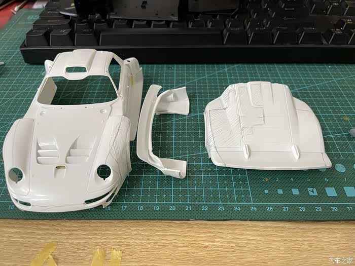 前期的步骤有点混乱,可以看到在标注阴影的区域,还有车身的合模线没有处理,在处理合模线的同时,对砂纸打掉的阴影区域进行补全。