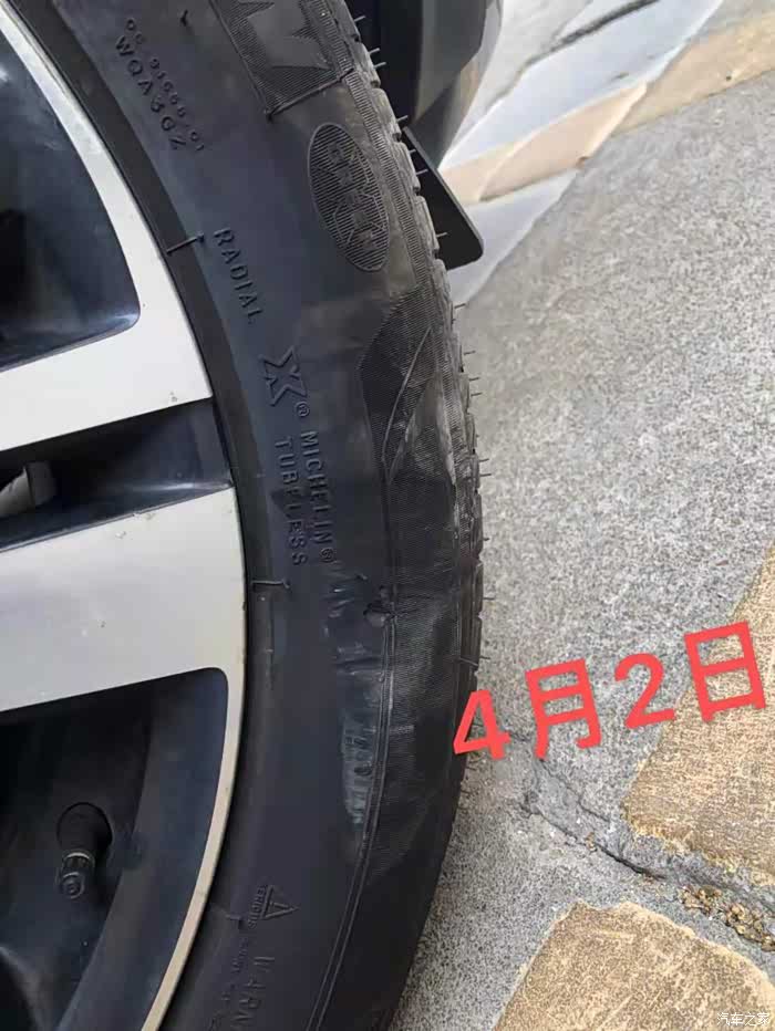 话说大宝学校放假了,开开心心地驾着大狮子去接她放学。回到家楼下,车还没停稳~窗外传来了“咔嚓”一声。心里咯噔一下,心里默默念起了咒语“不好的事情都走开哈,你无有理我,我无有理你,你无有理我,我无有理你…………”(这个咒语只有会粤语的朋友才看得懂哈,这里解释一下)。下车一看,果然难逃厄运……刚换的轮胎侧面被划伤了