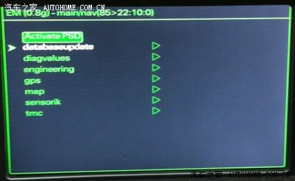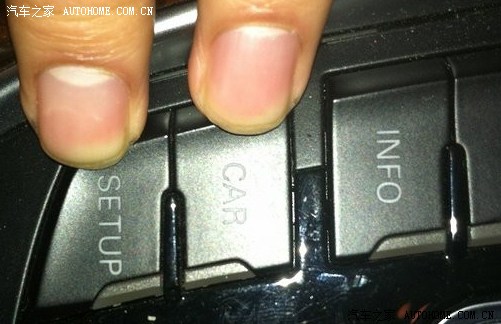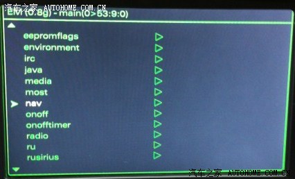 进入隐藏菜单:同时按住汽车排档旁边的car和setup两个按键几秒钟,屏幕上就会出现绿色的隐藏菜单。如果不成功,应该按键的顺序出了问题,保证两个按键是同时按住的,多试几次肯定成功。
