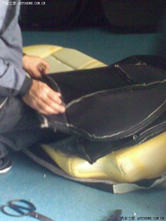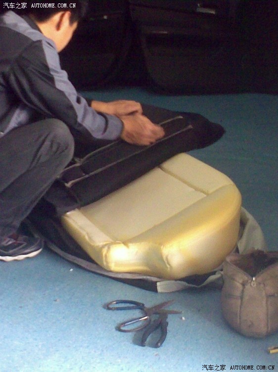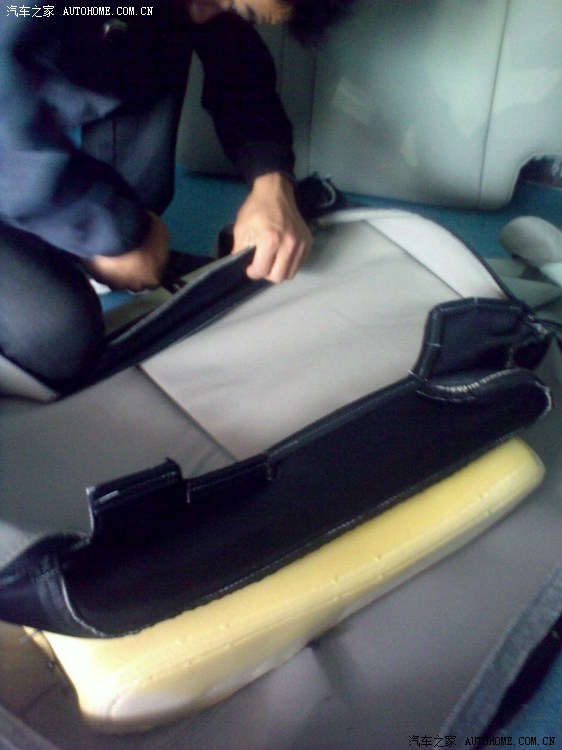 正在把真皮套子套在后排靠背上面,打钢卡呢↓