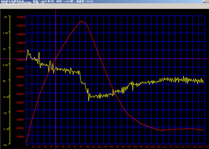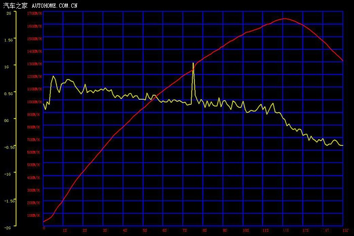 【 0---160公里/小时 】 纵向加速度G值,可以明显的看到换挡G值,结果如下: