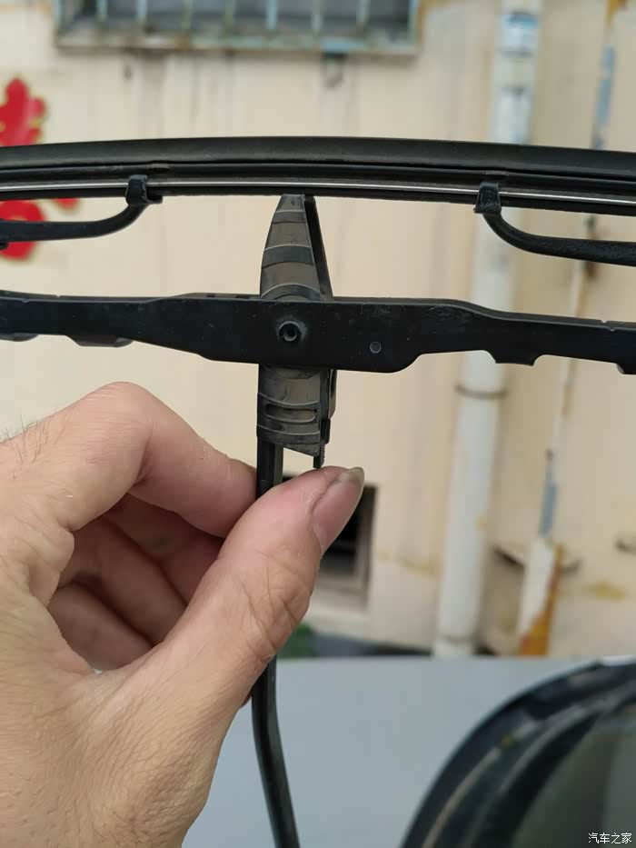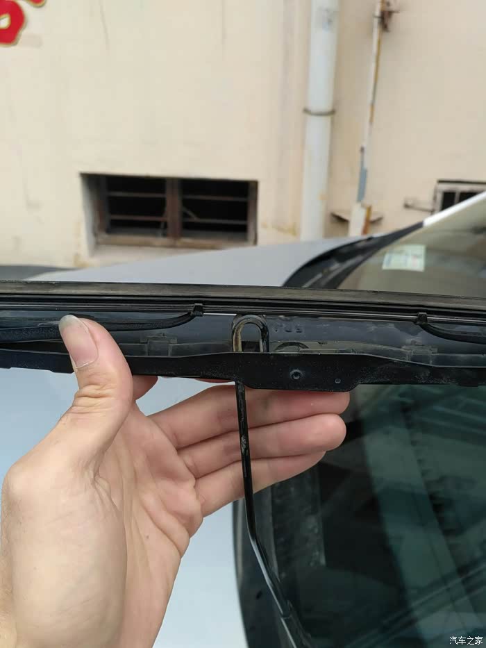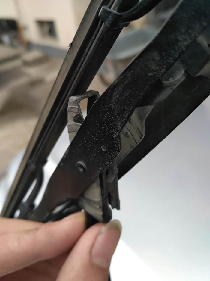 这里有个卡扣,按下去然后整个雨刮头斜着向下按,按下来以后横起来拔下来就行了,温柔用力很简单。