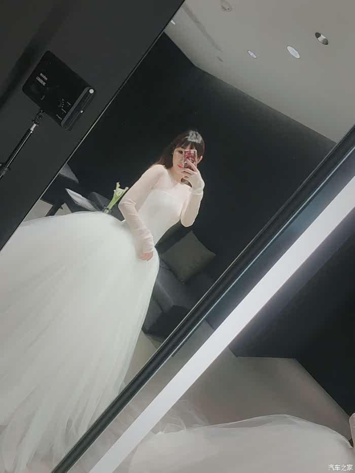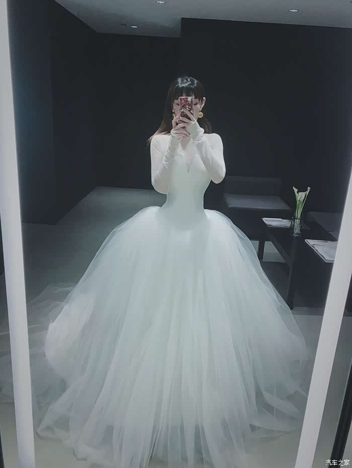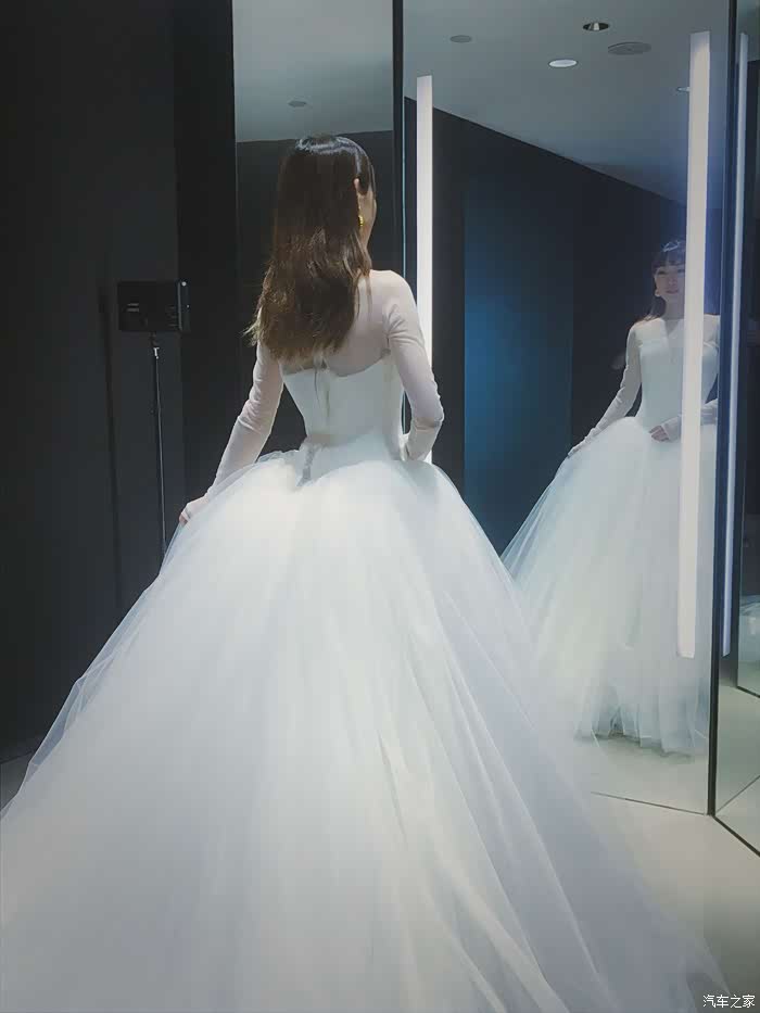 我选择的这款婚纱是带袖款,而且后背是拉链设计,穿起来会比系带的方便很多,裙身蓬蓬感很强,收腰部分的设计能很好的展现出腰线,尾处还带有一个1.5米长拖尾,只可惜少了头纱和高跟鞋,不然就真的是称得上完美了。