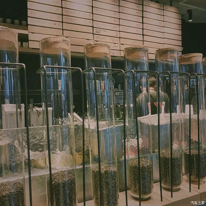 (喜茶店内吧台处,高高的试管形罐子里面装的都是茶叶)