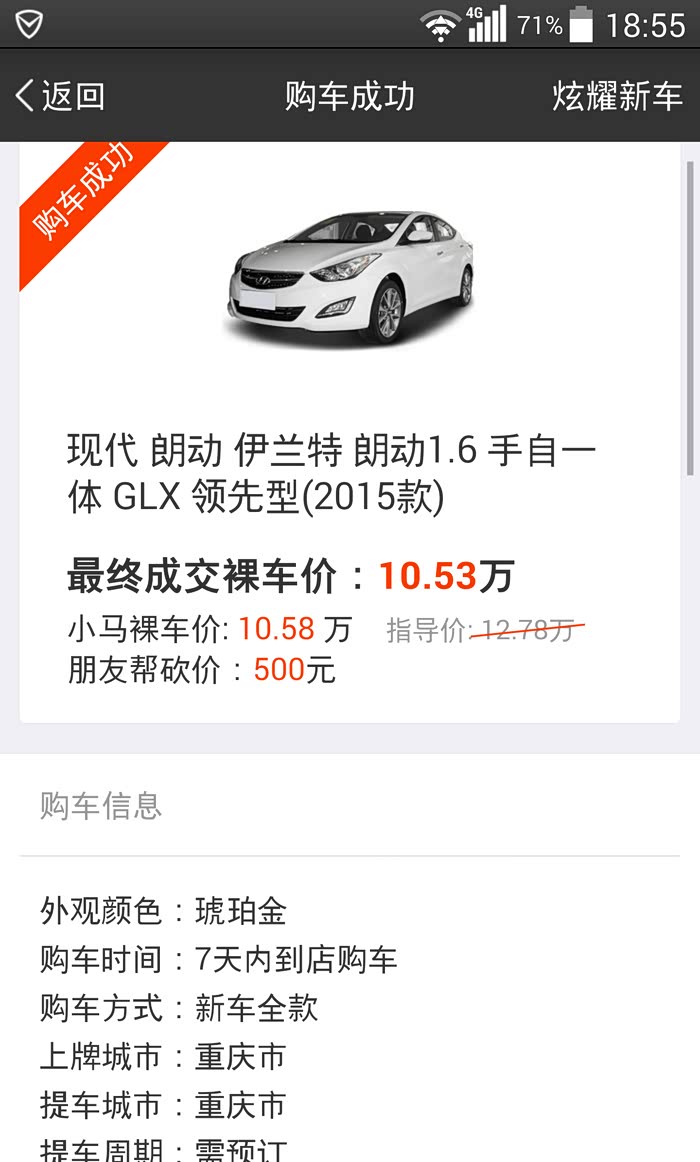 决定好了就是朗动以后,回去就想到了小马购车,然后通过小马购车进行询价,选定朗动自领琥珀金,一天以后小马报价出来了也是最低105800,客服还特意打电话给我解释说,因为是库存颜色特价,所以小马给出的价格和4S店最低价一样了。我只能偷笑,这么好看的颜色居然没多少人喜欢,相当白捡4K。然后立马在小马下定金然后领取购车凭证,约定提车时间,小马还指定了专人陪同提车。还提醒我可以转发朋友圈进行砍价,砍多少购车时候就免多少。我微信好友不多,一天才砍了500块,想想还是蛮不错的。