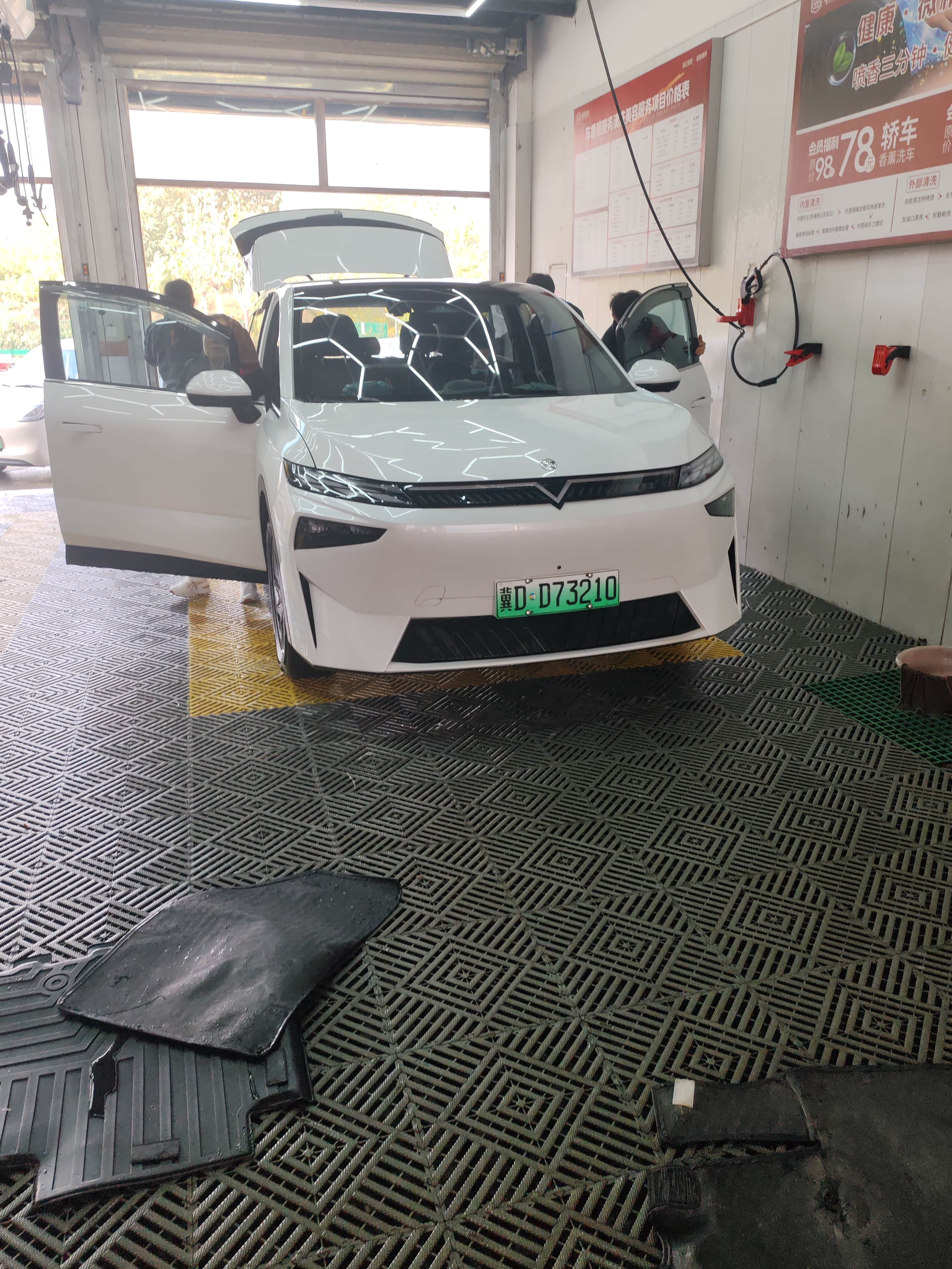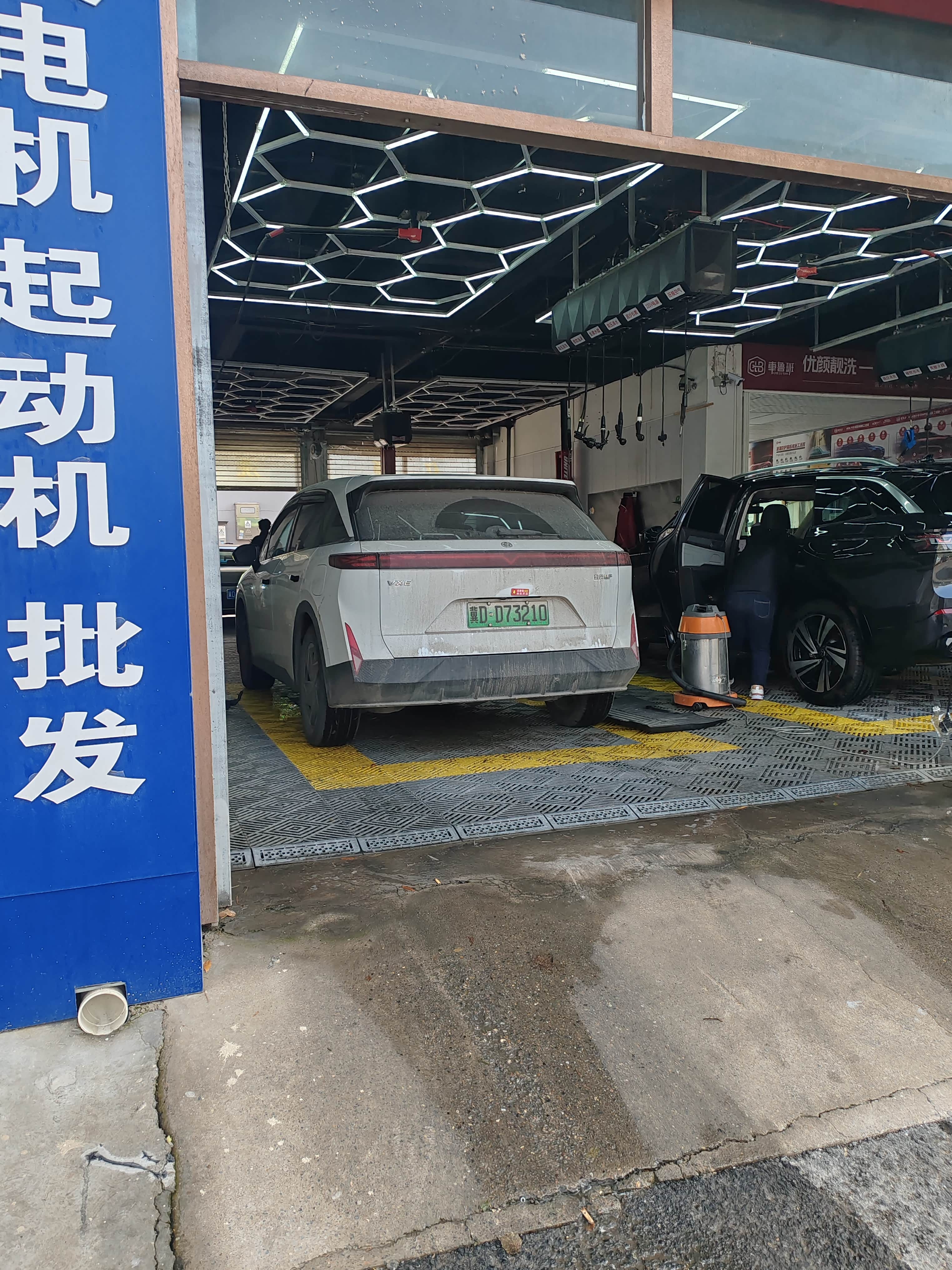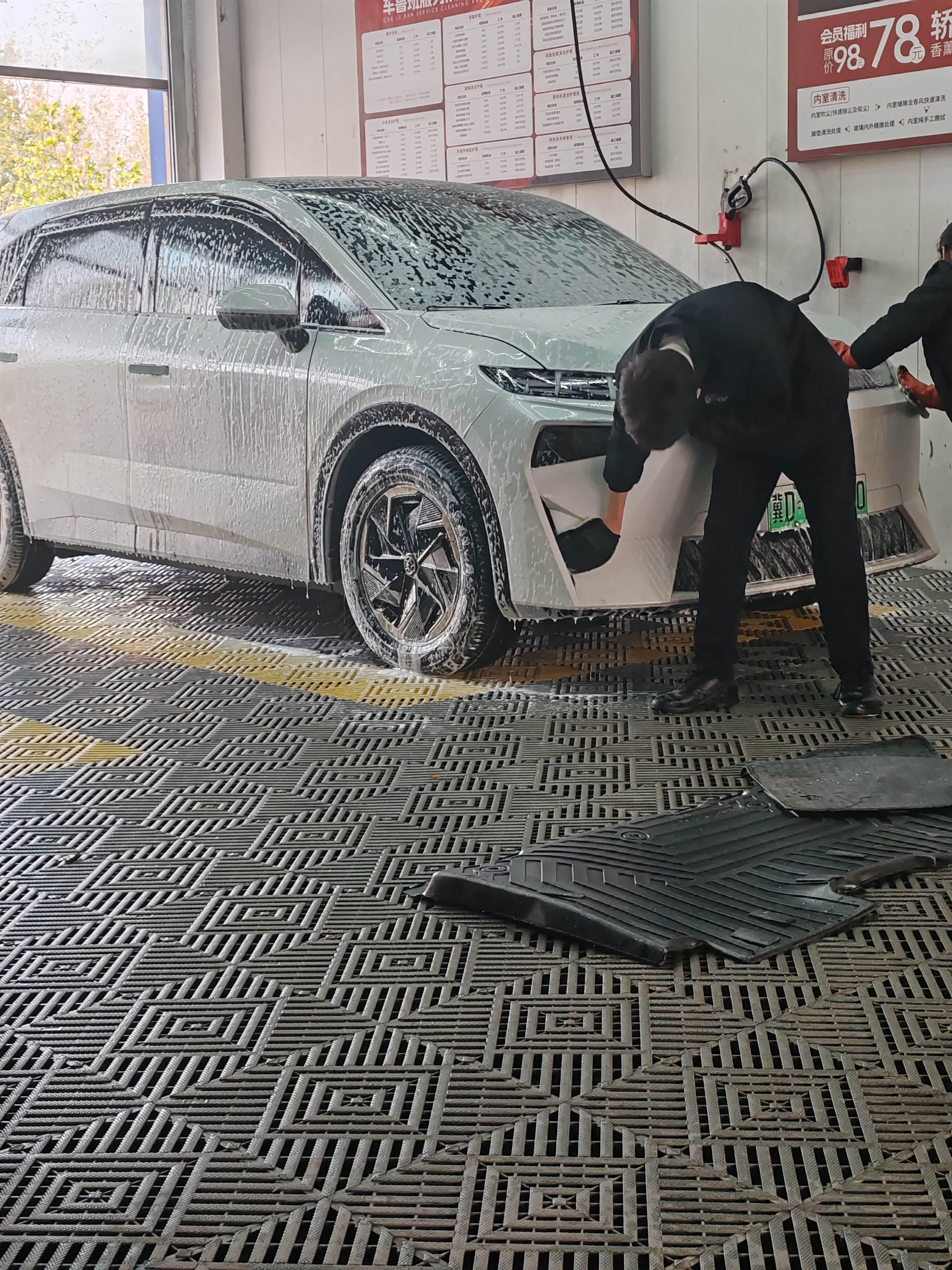师傅先给轮胎打上清洗剂又给车身简单冲洗一下打上泡沫三个师傅给它按摩,我看着都舒服(*¯︶¯*)!洗完之后闪闪发亮帅气的启辰VX6又回来了!它的漆是那种白色的珍珠漆灯光一照闪闪发亮!买的时候还加了2000块钱呢!前进气格栅是自动的,也洗的油光发亮!