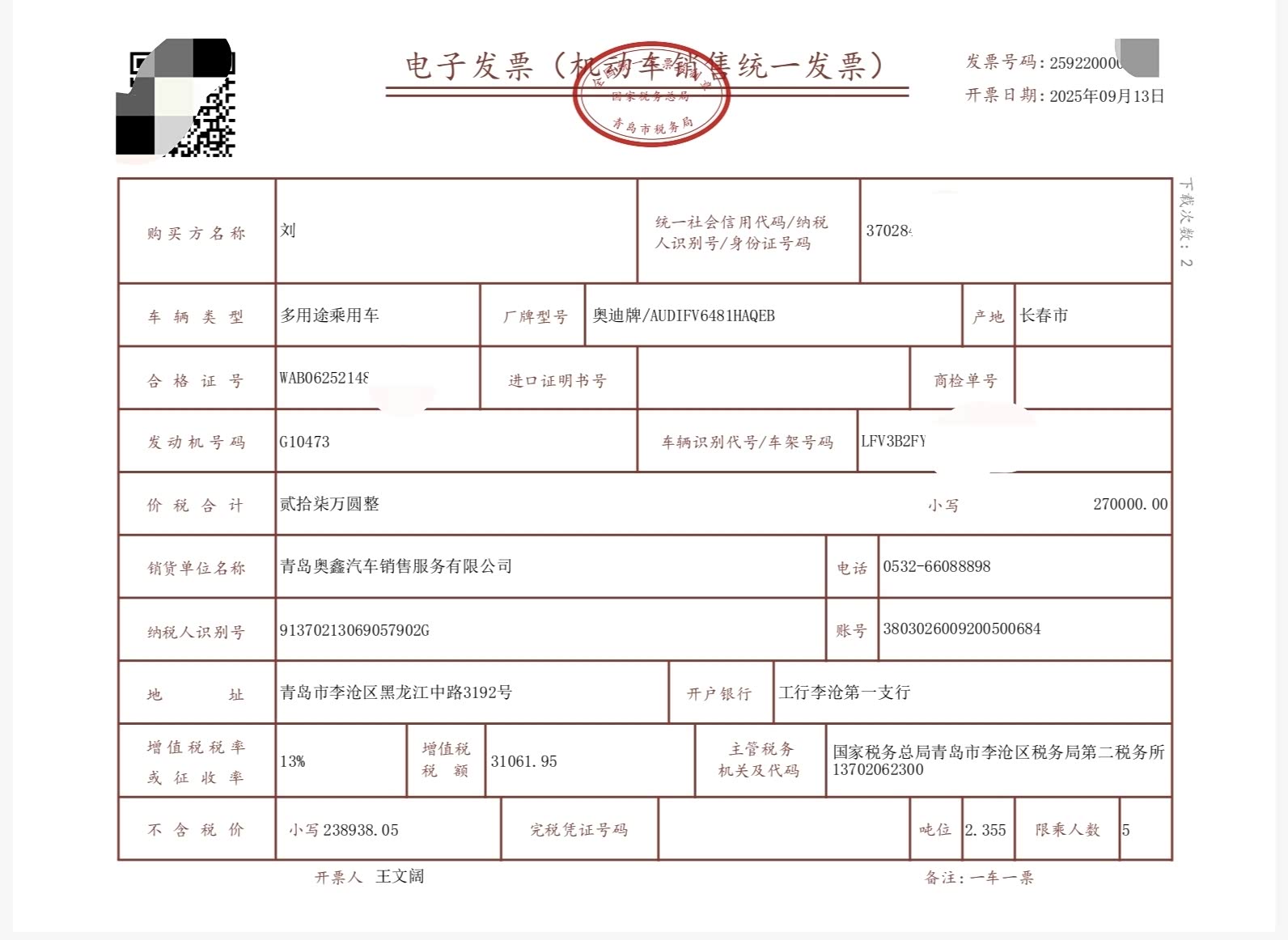 因为要抢首保补贴,所以要的现车,订车到提车只有两天。提车日,天气很好。前一天刚下过暴雨,估计4S给我洗车都省了。九月份青岛车展期间,交车较多,销售也比较忙,直接把钥匙给我,我花了近一个小时仔细检查车辆外观内饰,核对车架号、配置与合同是否一致。随后,在交付经理陪同下,清点了车辆合格证、购车发票、保险单等所有重要文件。一切无误后,销售耐心地为我讲解了车辆的基本操作,从启动、灯光到车机系统的激活使用。握着崭新的钥匙,坐进驾驶舱,点火,嗯一点油都没有了,让4S加点油,就拿来一矿泉水瓶汽油。。。。。。