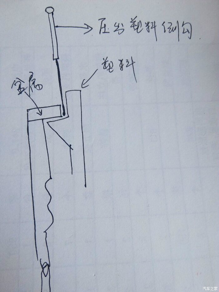 很多车友不明白,看我的简笔画吧,插头里面就这样子,你需要用一字 起子插到金属和塑料之间,开始别一直拉紧线,不然撬不动