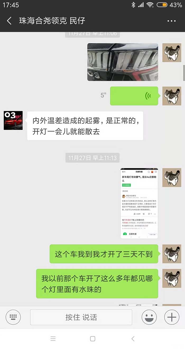 27日尾灯进水 4S给我换了一个尾灯 什么话也没说 什么也没补偿 干开发动机烧了一个小时 。