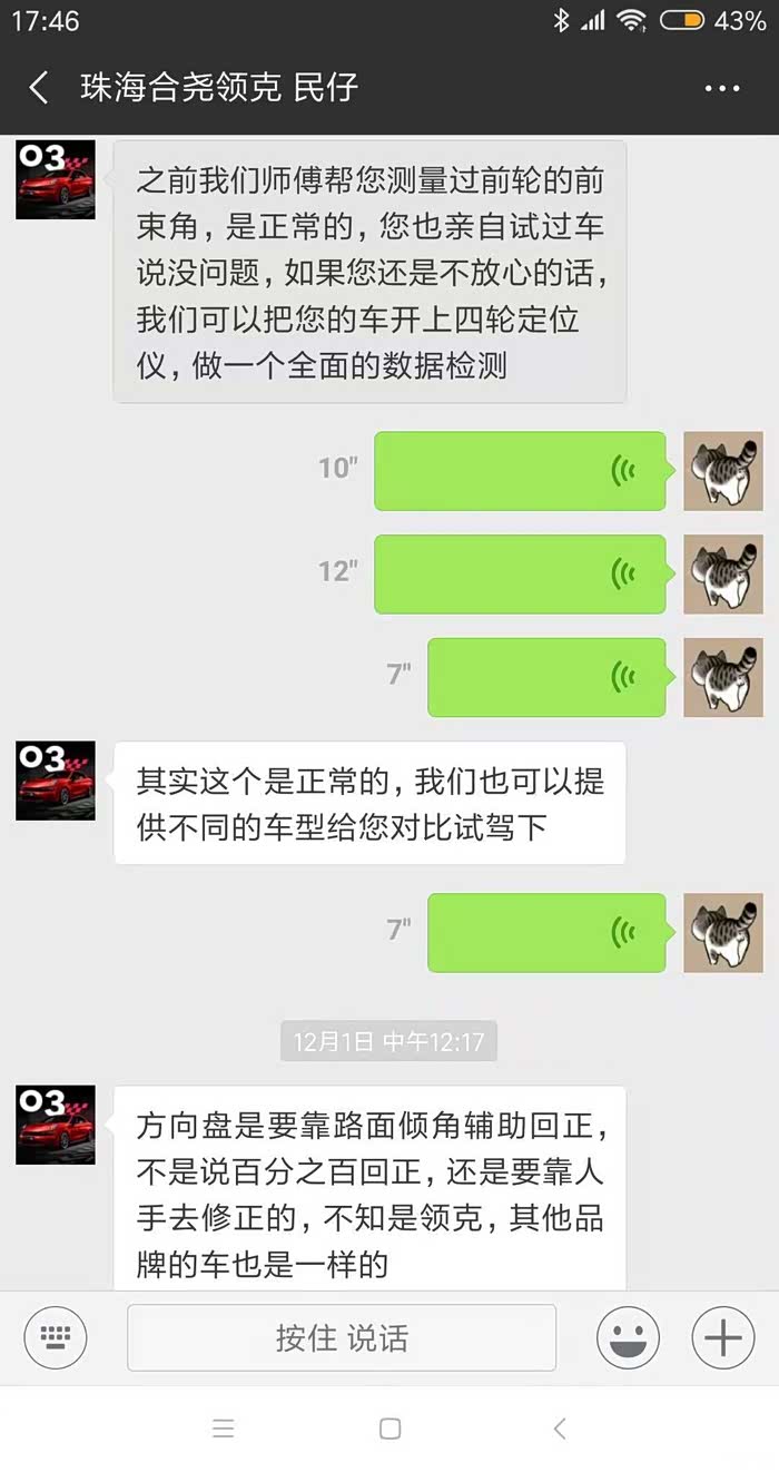 最后一次去4S是昨天 做了一个四轮定位。说实话那个表我也看不懂。师傅跟我说偏8度。又说10度以下都是正常现象。我也不懂说实话。但是4S店很牛逼。既不让我拍照 也不给我解释其他。并且跟我说他们的车都是这样。我试了一辆试驾03 比我的还偏。我也无话可说。试了一辆02。但是02就没有这个问题。