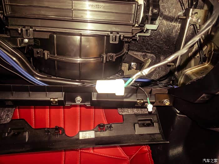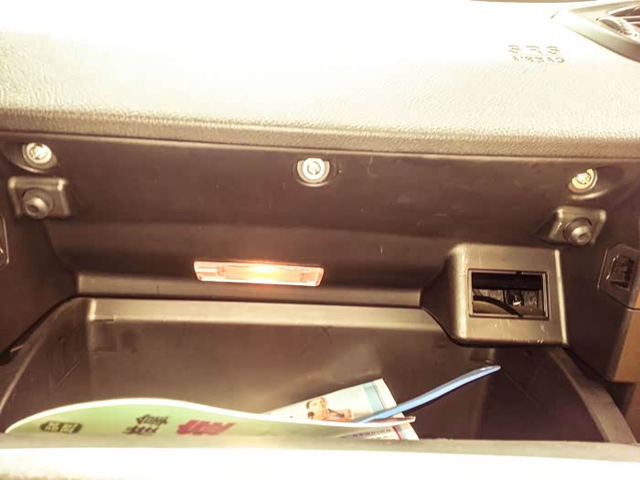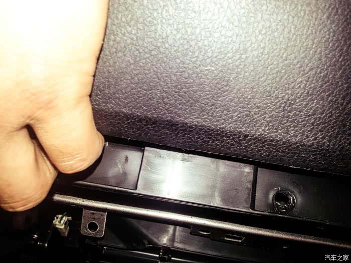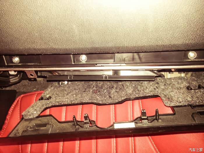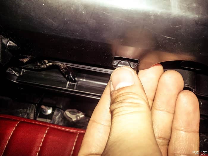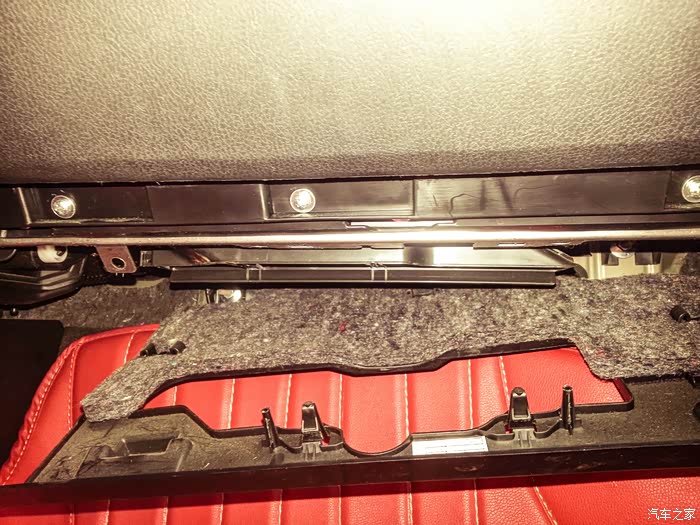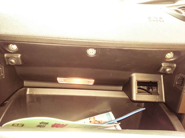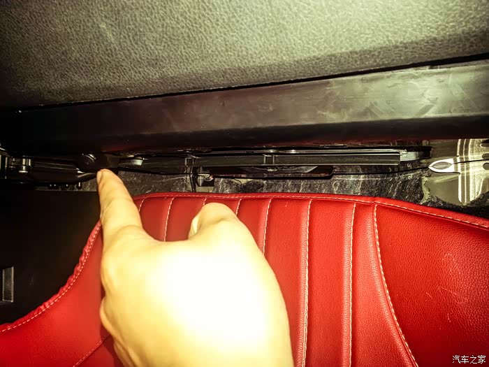 在副驾驶储存盒最下方我手指的方向有两个所料的螺丝,用一字口拧下来。