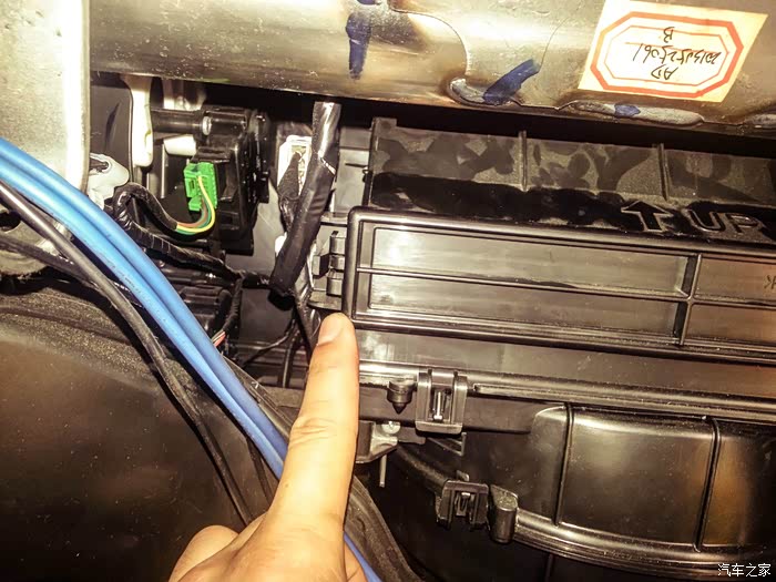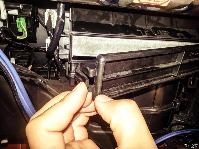 接下来就可以看到放空气滤芯的地方了,在我手指的方向有一个卡扣。