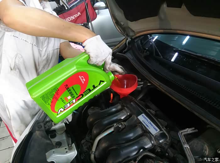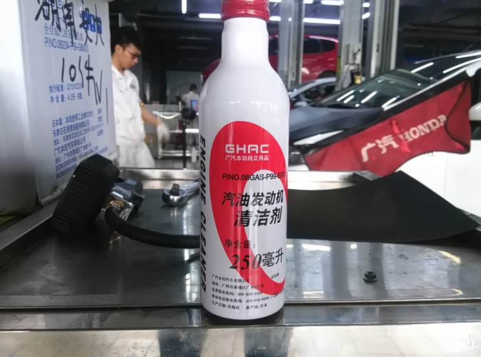 首先先加两瓶进去清洗,启动车子,前进挡、倒档都运行一下!