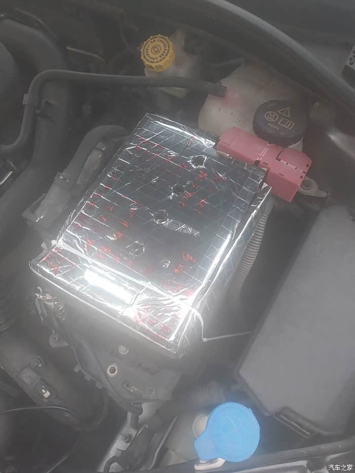 这是我装车的样子。网上有不锈钢的盒子和原电池一样大的盒子选择。价格有高有低就不说了。都要做好外壳内部的绝缘和保温。铁锂电池最高放电温度80多度。发动机舱温度正常也在这个温度范围。电池耐高温的但不高温又不低温是最好咯,这个空调海绵套管就能做到这些,即使单个电池故障也烧不穿它。我用喷火枪试过。停火就止燃。但电池到-10-20低温时容量损耗会变大。所以需要保温而又要隔热。电池面罩我用的是铝箔面海绵保温隔热材料。也是空调用的。如图