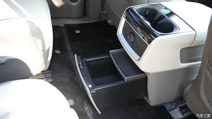 扶手箱的下层抽屉式设计,我猜测是冰箱,因为我未使用到,并没有测试到这个功能。