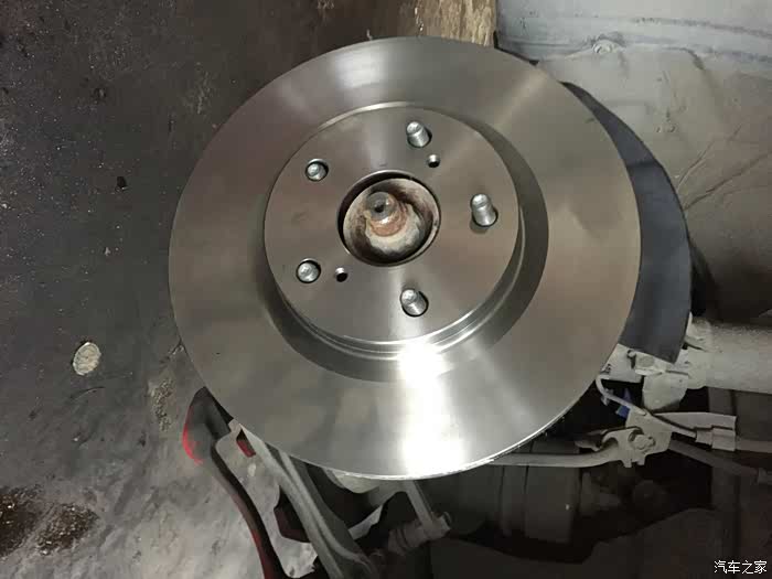 这是新的盘,当时忘记拍照片了,丰田汽车换新盘这上面没办法固定住,老是晃动,所以安装制动钳不方便,安装好一定要把刹车盘上的防锈油用化油器清洗一下,防止刹车片装上后打滑,还有就是清洁一点,有沙子之类的也会把盘磨坏