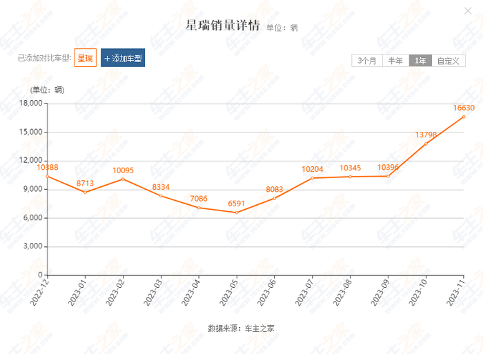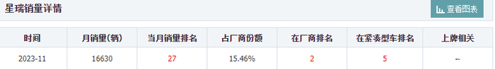星瑞2023年11月单月销量创新高:16630辆,紧凑型车排名第5名。