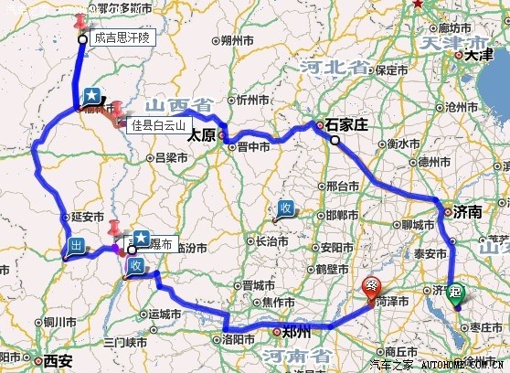 滕州→菏泽→郑州→山西吉县→壶口瀑布→陕西延安→内蒙成吉思汗陵、草原→陕西榆林→陕北佳县白云山→太原(返程)→石家庄→济南→滕州(全程计划大约在3000公里左右,实际将近3300公里,且路线稍有变化,未去白云山,改去雁门关。)