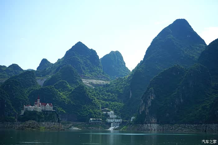 前面岸上左边那个白墙红顶的房子就是吉隆堡度假村,它位于万峰湖西北角 ,是一座隐藏在万峰山水之间的天鹅城堡。度假村紧邻湖水,有一个小岛,湖边修了木栈道,可以沿着木栈道一路走过去。图片中间的房子是个小型水电站。