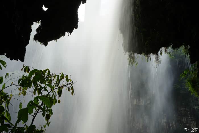 从这个角度可观看对面崖壁的瀑布全貌,只见瀑布又高又急,从谷顶冲下,水花飞溅,晶莹而多芒,氤氲弥漫。