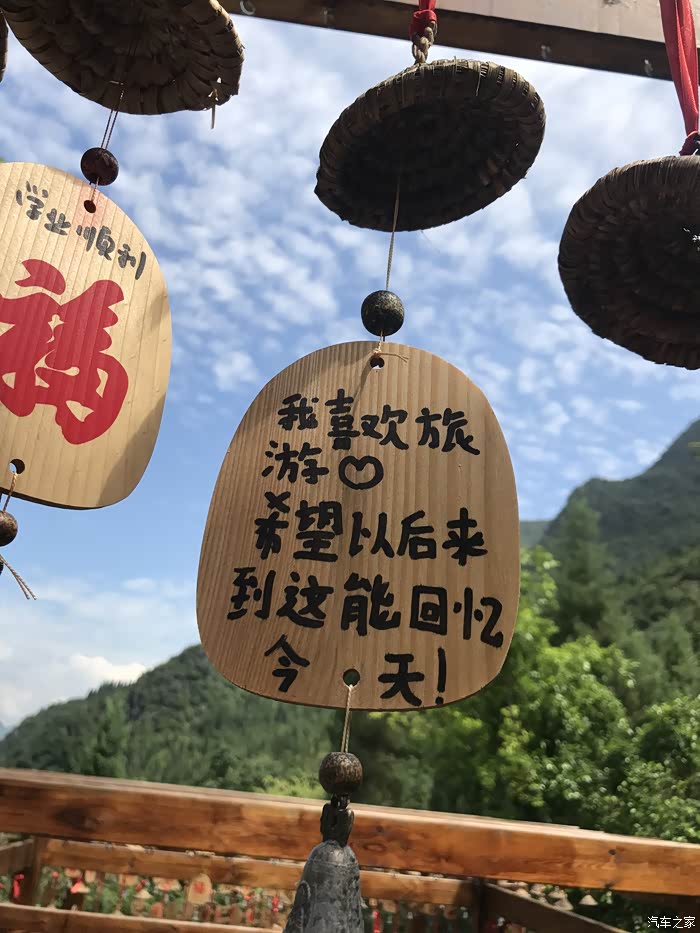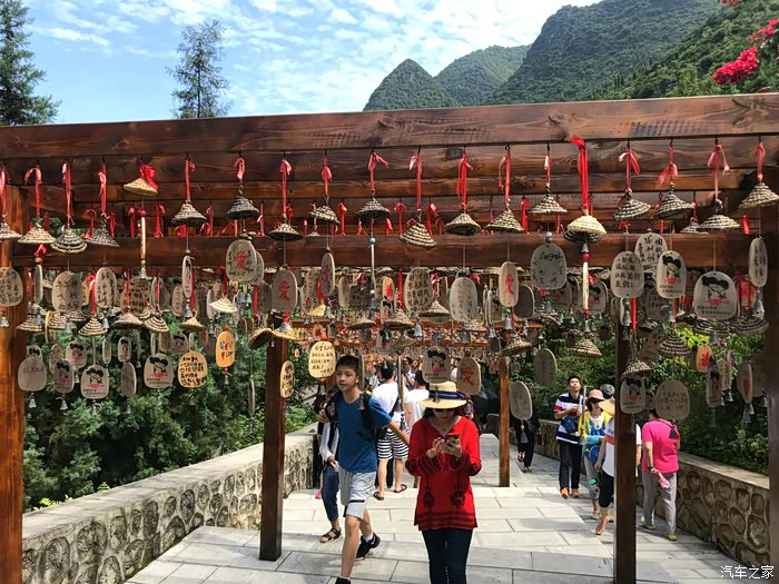 下观光车攀登另一个观景点,要经过一个许愿长廊,长廊上面挂满了各种各样、造型别致的祈愿牌和祈愿风铃,祈愿牌上是游客写下的对家庭、事业、健康、爱情的诉求。