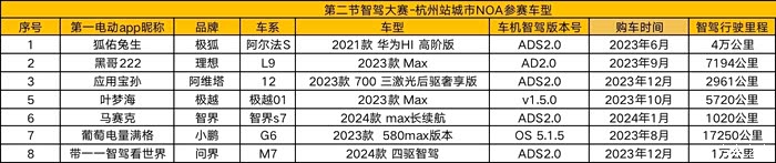 参赛车型:极越01、小鹏G6、理想L9、阿维塔12、智界S7、极狐阿尔法S、问界M7等多款具备城市NOA智驾能力的车型。