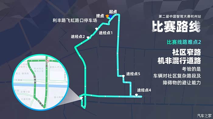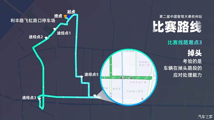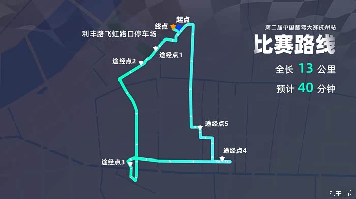 比赛路线:全程13公里左右,途径3个“考核”点,包括环岛、小区路况、隔离带掉头等区域。