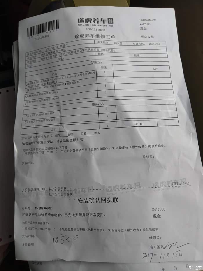 年初保养的,眼看下半年就要过完了,虽然车车各方面正常,但是保养还是该好好搞一下的。正好碰上双十一,活动比较给力,于是在途虎上下单搞个保养,内容包括更换机油,机滤,空气滤芯,机油买一送一,还送一瓶3M燃油宝。