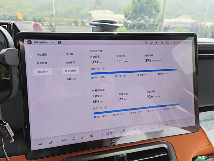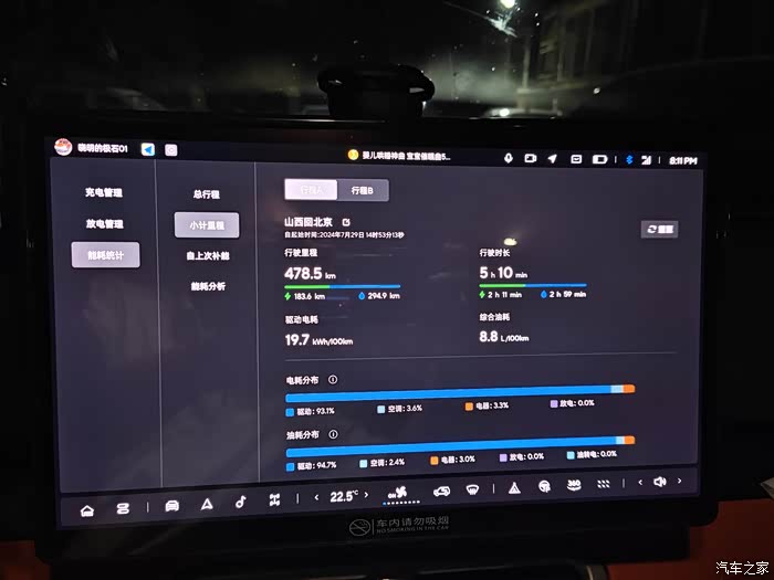 从山西出发到北京目的地,5人加满仓行李物品,一路没有休息,开着空调,开着座椅通风,听着歌全程用时5个小时,行驶了478km,其中电走了183km,油走了295km,电耗19.7,油耗8.8,最后WLTC显示还剩638km,总1115-还剩638=477km,与实际行驶的478km相差无几,不过8.8的油,有朋友说不高,也有朋友说跟油车差不多,但总体上比我去程要耗油更低了。把这个数跟网上许多增程车的油耗数据对比了下,感觉对于极石01这类车来讲,8.8的油算不错的表现。