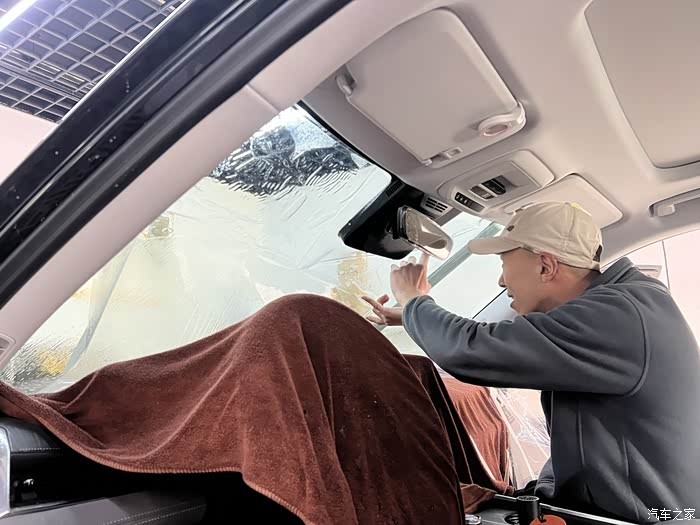 3.然后对车玻璃进行清理,我看着先是喷了除胶剂,然后使劲擦,然后再喷除胶剂之后用壁纸刀刮,最后确保车玻璃内侧干干净净,一尘不染,按说应该是在降尘车间操作,但是这边确实是简陋一些了!