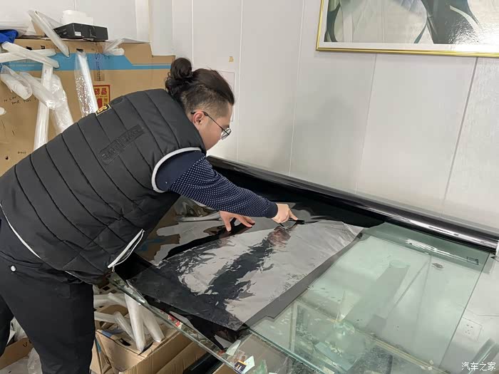 4.将精剪好的膜贴上去,然后就是挤压排掉里面的水和气泡,会用刮板反复刮水除泡,这边的师傅技术还是很不错的,贴的非常板正,第一遍刮水之后还再重复一遍刮水,两遍之后基本上就没有积水和气泡了!