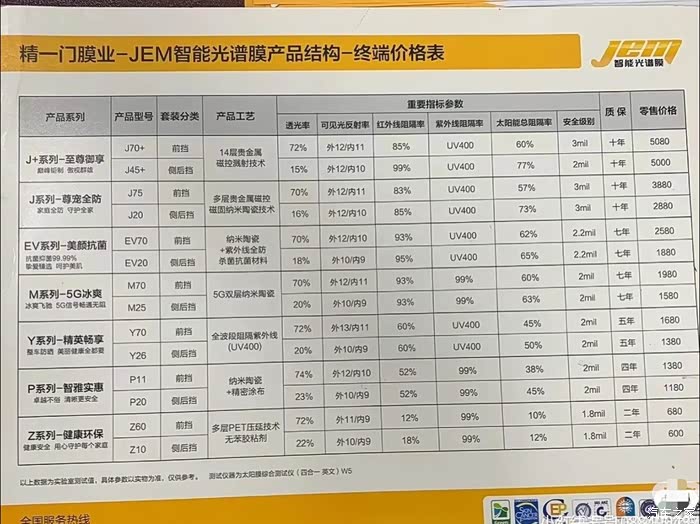 1.赠送的是JEM吉膜健康环保膜,应该是他的第二代产品,代号是Z系列,前档是Z60,侧后是Z10,这个膜确实比较差,红外线阻挡率分别只有12%和18%,太阳能总阻挡率只有10%和12%。