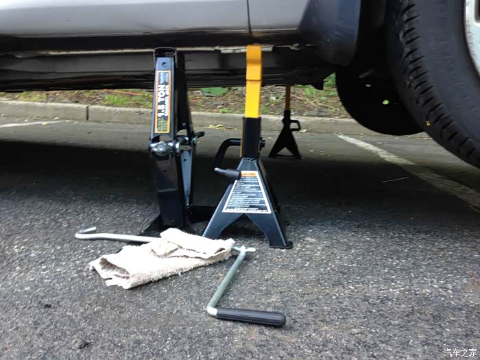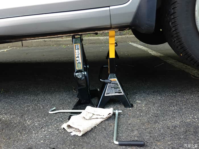关于机油,我用的是美孚的全合成HM系列机油,High Mileage,对于将近15万公里的车,用高里程机油是对防漏防烧机油是有所帮助的。粘度来说,我不乱用高粘度的,官方推荐5w-20m,我就用的5w-20。再有一点跟平时不一样的是,我这次要进行轮胎的轮换。其实,只用千斤顶+备胎帮助这种方式也可以进行轮胎的轮换。不过我是觉得那样不爽,正好买了两对儿安全支架,索性就把车子四脚离地,再调换轮胎位置。