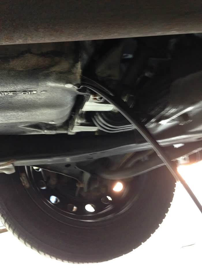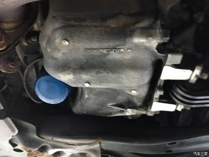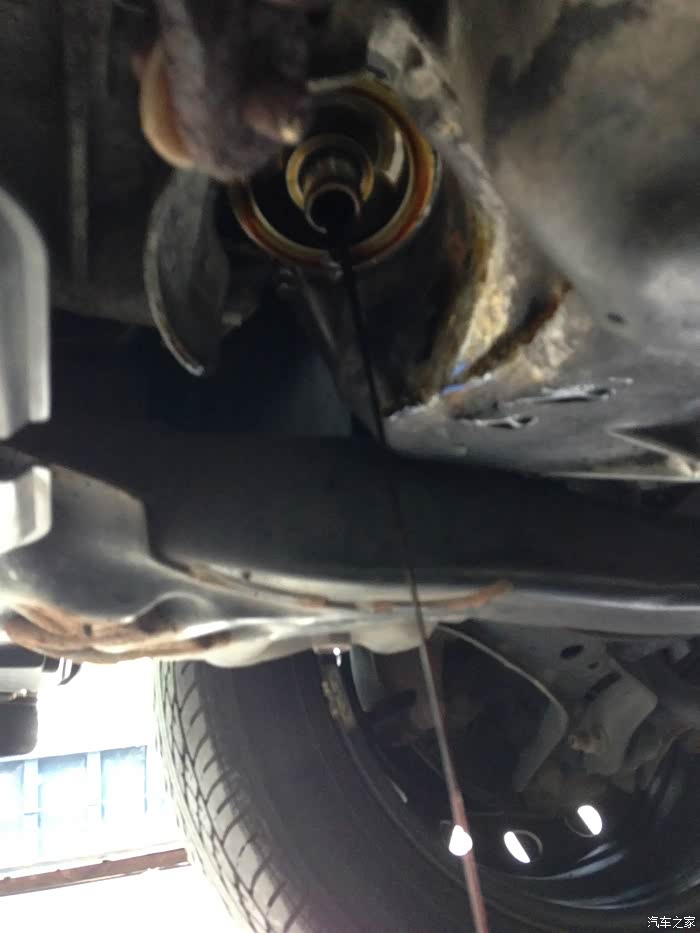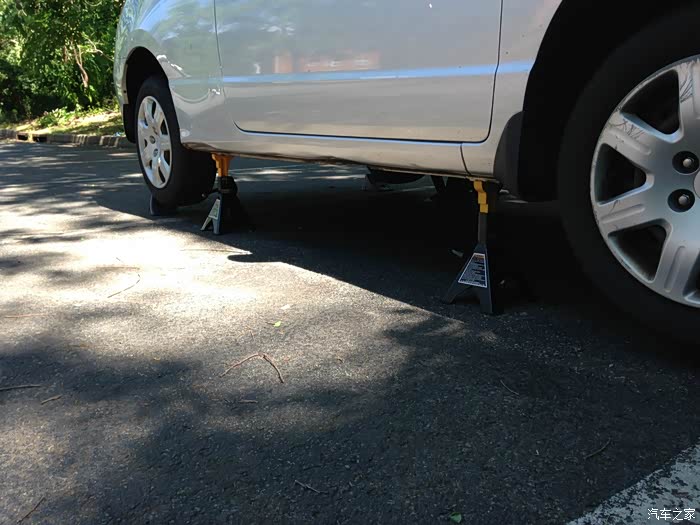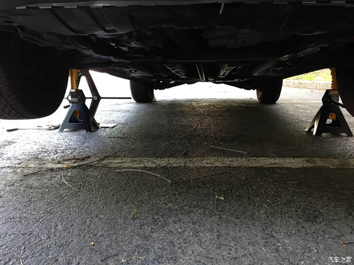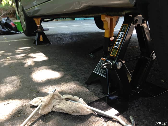 先换机油,所以先程撑起来前面,用的安全支架承载力每一对儿4吨,车子才一吨多,所以很稳。