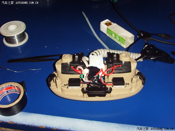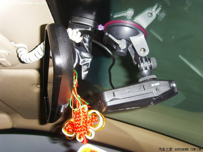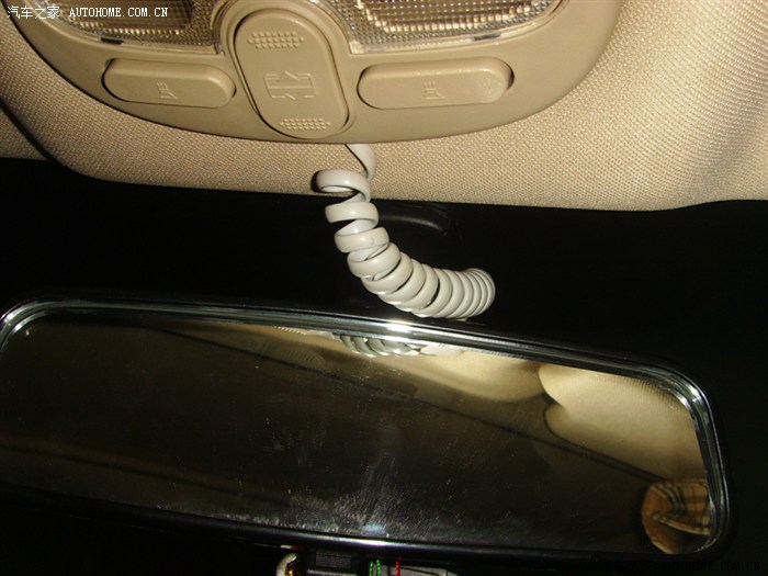 然后恢复,我没有将这个12v变5v电路塞入到顶灯里面,里面空间还是大大的有的,藏私房钱绝对好地方,只不过不要塞里面太深了。而是将它放在反光镜的后面,我也不知道怎么放好,累了,直接绑上,见下图: