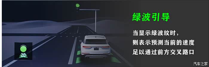同时,这一功能还可以帮你预测当前的速度是否足以通过交叉路口,当显示绿波纹时,则表示可以。若预计不通过,则会发出声音和视觉警报,以通知驾驶员放慢车速停止车辆。