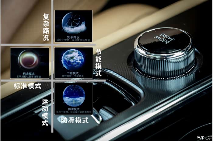 通中控下方的旋钮可以切换5种驾驶模式供你选择, 复杂路况,轻松自如。