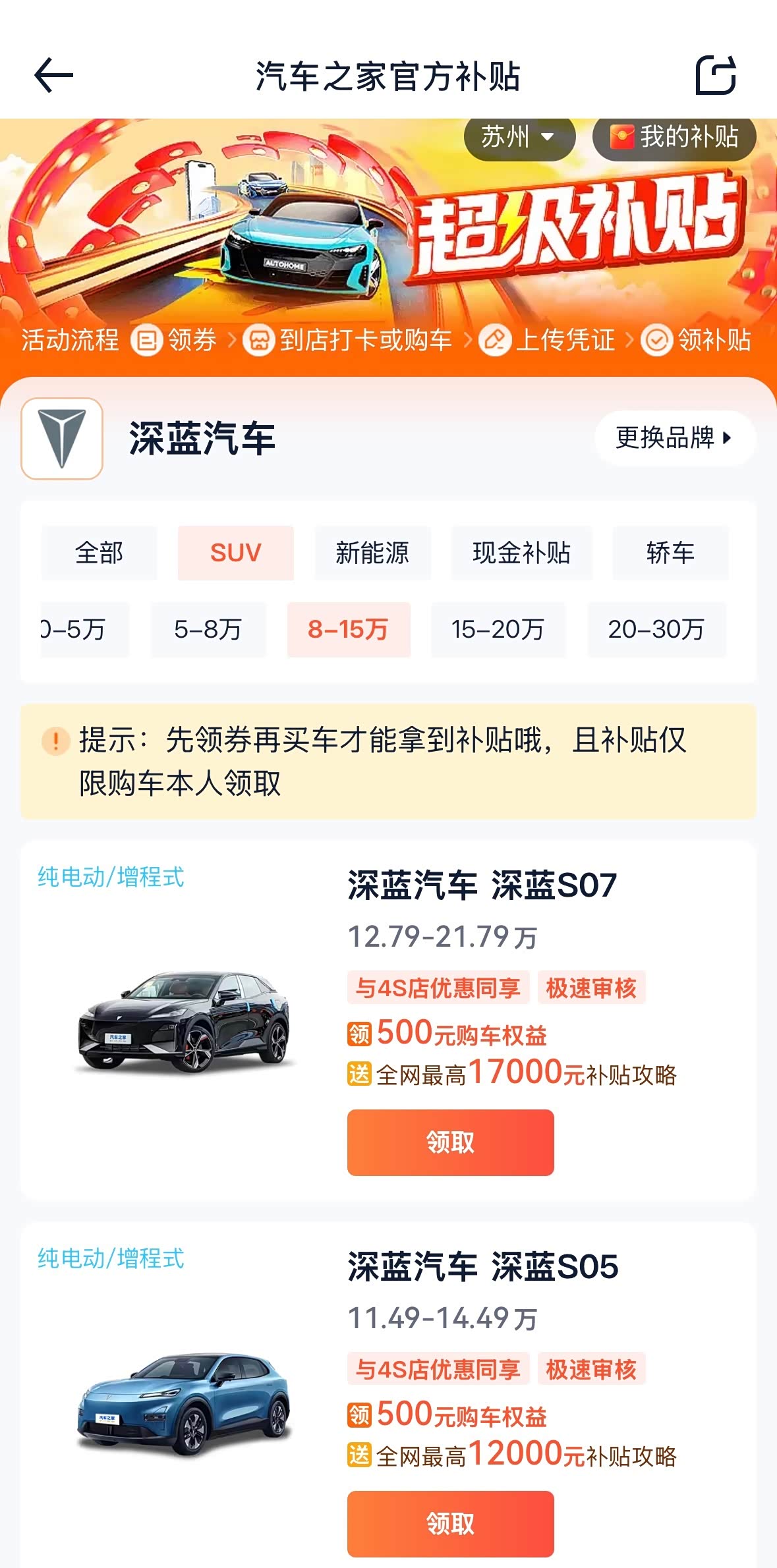 汽车之家购车补贴说明(购车前在汽车之家APP上领取才可以) : 汽车之家官方的补贴活动,覆盖上千款车型都可领取,最高可领4000元补贴;且与厂家无关,可与4s店优惠同享优惠。如:深蓝所有车型就有500元的补贴,且与4s店优惠同享; 购车之后上传凭证至汽车之家 APP, 审核通过后会发放购车权益至汽车之家 APP 账户,非常简单方便,只要动动小手就能拿500元。